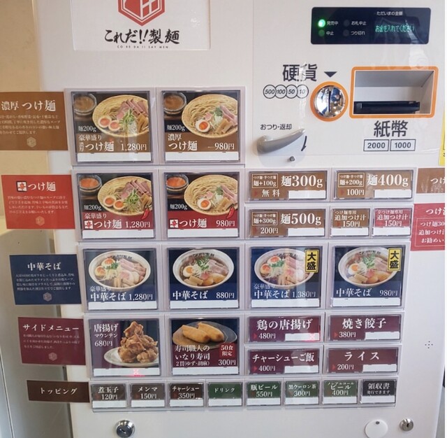 辛つけ麺は デフォルトは200グラムで300グラムまでは無料でサイズアップできる。 麺は「濃厚つけ麺」「辛つけ麺」「中華そば」の3種類。