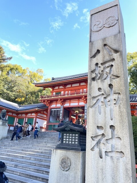 2階へ上がり、窓ぎわのカウンターに座ると、外には八坂神社が見える。