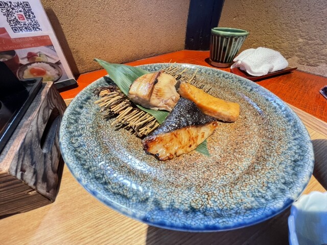 お魚好きの料理長が選ぶ、その時期旬の香ばしくふっくらと焼き上げられた魚は炊き立てのご飯にぴったり。銀鱈・鯖・鮭の三種 小骨が少々気になるところ。