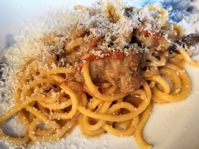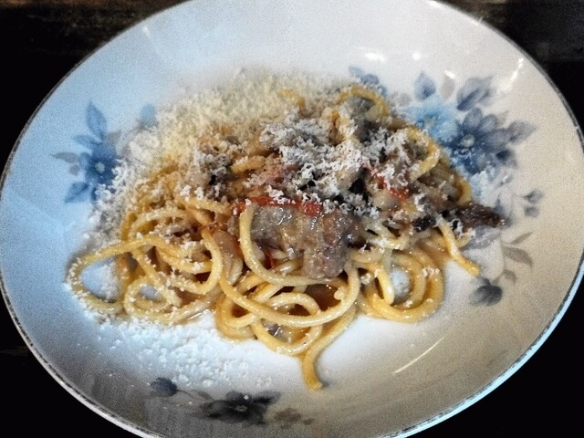 ◆イノシシ×レンコン×遠野・村上さんのトマト×自家製スパゲティーニのボロネーゼ