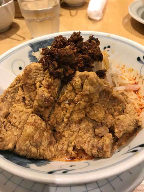 宣言どおり連日行ってしまった。そうであれば、冷やし排骨担々麺でしょー。相変わらずストリーミングなおじさんの動きにほれぼれしながら待つ。おお、きたぞ排骨。冷たい麺とスープの中にあって、肉だけは今揚げられたので温かい。麺の風味は温かい麺の方が感じられるが、汁の胡麻感は冷たい方が勝る。そして、温かい担々麺より汁が少ないので、排骨が汁に浸かる率が低いので、排骨自体の旨味がストレートに感じる。うーん、これは旨いね〜、なかなかこんなに大きな肉は見ないよね。連日来てよかったな。3日目はあるのか?