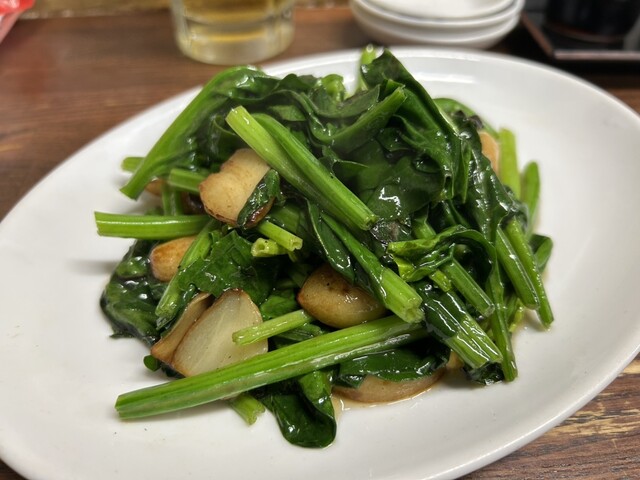 餃子と青菜炒めでビールがすすむ!( ^ω^ )