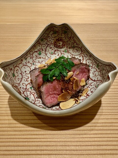 店内は美しいカウンターで、肉にこだわってるということでお伺いしましたか、肉だけではなく、山菜をはじめ季節の食材が独創的に調理されて出てきます。また、こだわって選ばれた器もとてもいい。