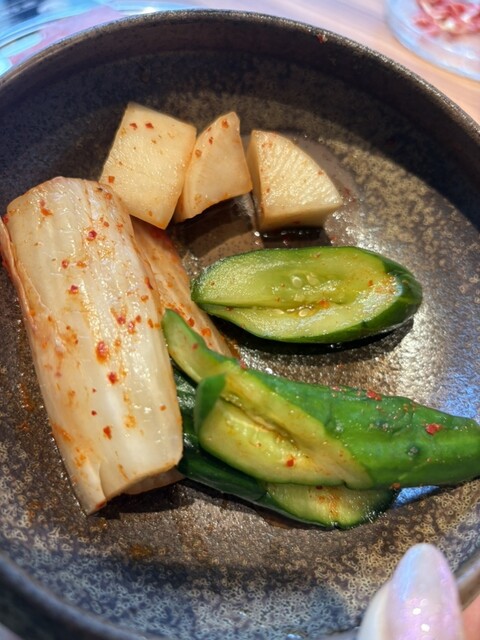 前回いただいて感動したこちらの店舗でしかいただけない浅漬けキムチと梅ミノは絶対外せないメニュー。