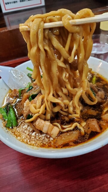 トップには漬け脂がたっぷり掛けてあり、左右に刻みニンニクとショウガ。豚バラやニラ、白菜、玉葱等を炒めた具が乗っかり、脂ギッシュな暗黒醤油スープ。麺は三河屋製麺のウェーブがかった極太。これは!たまランチ会長ですね。飢えた紳士淑女のハートを鷲掴みするのが分かります。この日は男率100%だったけど(^_^;)