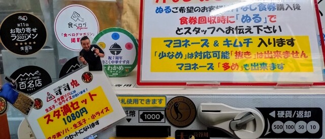 先にタッチパネル式券売機で食券を購入し、助手さんに食券を預けます(辛いスタ満ソバなので辛さLEVEL「ちょい辛」、麺は太麺でお願いしました)。前ロットのリーマン1人が大幅なロット崩しをやってくれたので、後ロット5人の中で私だけかなり遅れて着席。並び始めて30分程で着席ですかね。私の後ろにも10人程のお客さんがいらっしゃり、24時で締め切りでした(*・∀・*)