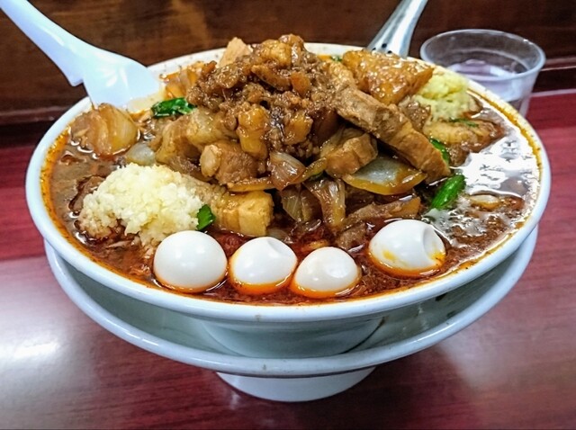 麺大盛りにしたので、二重丼で提供。トップには漬け脂がたっぷり掛けてあり、左右に刻みニンニクとショウガ。中心部には、豚バラやニラ、白菜、玉葱等を炒めた具がガッツリ乗っかり、脂ギッシュな暗黒醤油スープ。この辺りは、房総のご当地グルメ「アリランラーメン」を意識していますね。麺は三河屋製麺のウェーブがかった極太。鶉の卵、通称「まさお」もデフォ1個+3個で存在感を示しています。これは!もう、多摩ランチ会長ですねえ ლ(´ڡ`ლ) 飢えた紳士淑女のハートを鷲掴みするのが分かります。この日もですが、男率100%だったけど(^_^;)