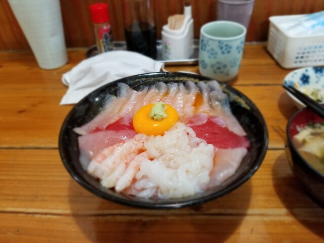 本命の平目・えんがわ半々漬丼を食べようと、早朝盛岡を出発して、7時半に店に行ったけど、名前を書いての順番待ち。7時50分ごろに店に入って注文しようとしたら、またしても目当ての平目・えんがわ半々漬丼は完売。仕方なく、ザ漬丼を注文暫くすると、ヒラメやマグロ、甘えび、ヤリイカの漬けの上に卵の黄身が乗った丼が登場。卵と漬けの刺身を混ぜて食べると、海鮮丼とは違う、卵と漬け刺身のたれと混ざった、濃厚なうまみの丼ぶり、とても美味しく、本命を増々食べたくなりました。今度こそもっと早起きして食べに来ます。