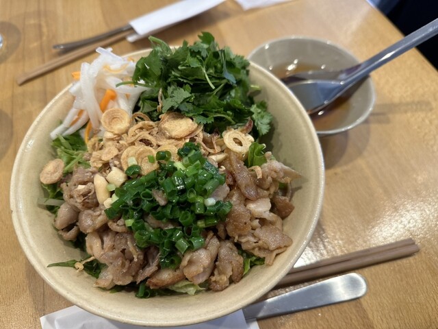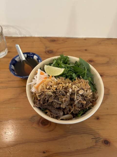 本格的なベトナム料理が好きな方は「牛焼肉のせ混ぜ麺」がおすすめ。フレッシュなハーブとライムを絞って食べます。
