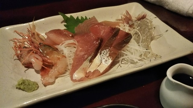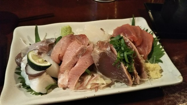 本日は、黒ぞい、本マグロ、朝イカ、湯通しタコ、カツオたたき、ぶりの6種でした☆薬味もワサビ、ミョウガ、生姜、すだち?が付いていて、いろいろ味を楽しめます。
