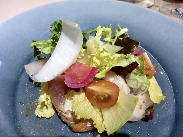 アミューズ:(上)いわゆるビシソワーズ。若干酸味があります。(下)豚のリエット。特殊な豚でしたが名前忘れました…