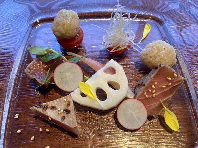 ◆「プルミエ」は、媛まぐろのグリエと野菜のピクルス。四角い透明のガラス皿に、香ばしく炙ったまぐろ、プチトマトの上に野菜とコシヒカリ、バルサミコで味付けた手毬、蓮根のピクルス、白髪ネギ、茗荷が綺麗に散りばめられ、まるで八寸のよう。ワインは、ウ・メス・ウ・ファン・トレスのブリュットのロゼ、葡萄は珍しいトレパットとガルナッチャのブレンド、果実の繊細な味わい、爽やかで飲みやすい中辛、少し強めの泡が見事にまぐろの臭みを消してくれる。そして茗荷が全体を引き締め、最高のハーモニーを奏でる逸品。