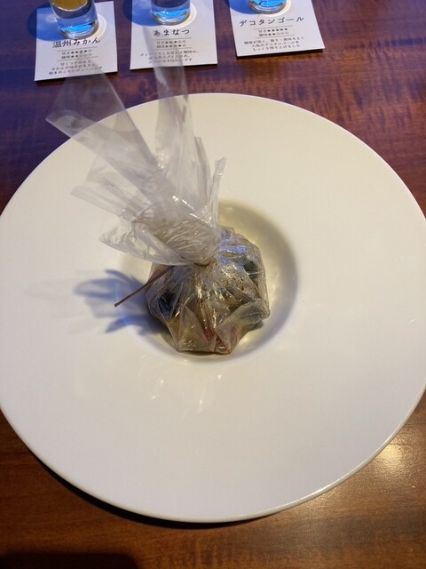 ◆「デュゼーム」は、茄子とサザエのカルタファタ包み。白磁の丸皿のカルタファタを解いて開くと、一面茄子の香りでいっぱいになる。中にはサザエ、青じそ、トマト、茄子の旨味が凝縮されている、特に焼き茄子の出汁がよく染み出していて美味しい、トマトの酸味がいいアクセントになっている。ワインはグルジア産、ワイン発祥の地コーカサスのパパリ・ヴァレー。エレガントで芳醇な果実味が特徴のオレンジワイン、茄子とワインの香りがとても心地いい。