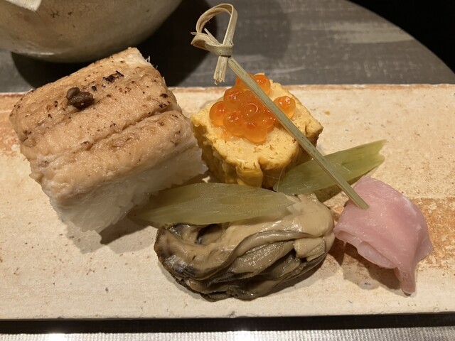 ◆「雪待ち」は、前菜の部、食前酒、先付け、前八寸で構成されている。黒塗りに銀の満月の盆の上に、食前酒の梅酒が右下に、上部にはハートにも見える器に入った先付けの、蟹身と芹のお浸し、その下には長皿に右端から、黒のお猪口にヴィーガンスープ、その横に出汁巻きに味噌漬けのいくら添え、生ハム、蕗、牡蠣の旨煮、穴子の棒寿司、左端には銀杏と椿の葉が添えられた前八寸。まずは梅酒で乾杯、さっぱりとした飲み口。先付けの堀込で採れた芹はシャキシャキ食感、薄味の出汁は蟹の甘味を引き立て、剥き蕎麦と天かすともよく合う。八寸のスープはカリフラワーの味がとても印象的、出汁巻きは濃厚甘め、いくらと相性抜群、牡蠣とサクサク食感の蕗もよく合って繊細な味付け、穴子はフワッとしてとても柔らかい、生ハムはスモークした香りがいい、どれもとても繊細で手間を掛けた料理ばかりでとても美味しい。日本酒飲み比べ(1320円)をお願いして一緒に頂く。