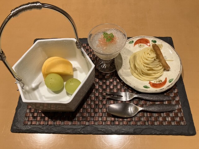 ◆「可憐な」は水菓子の部、六角の器に入った庄内柿とシャインマスカット。その隣のグラスにはラフランスのゼリーとコンポート、上にグレープフルーツの果実とミントの葉で彩を添えた可愛い一品。その隣のお皿が見た目も美しい丸十で作ったモンブランにスイートポテト添え。ラフランスのゼリーとコンポートはあっさりして美味しい、モンブランは中の具やクリームともよく合ってとても美味しい。旬のフルーツだけでなく、手間を掛けてこしらえたお洒落なデザートたちは全ての料理を讃え、締めを華やかにしてくれる。