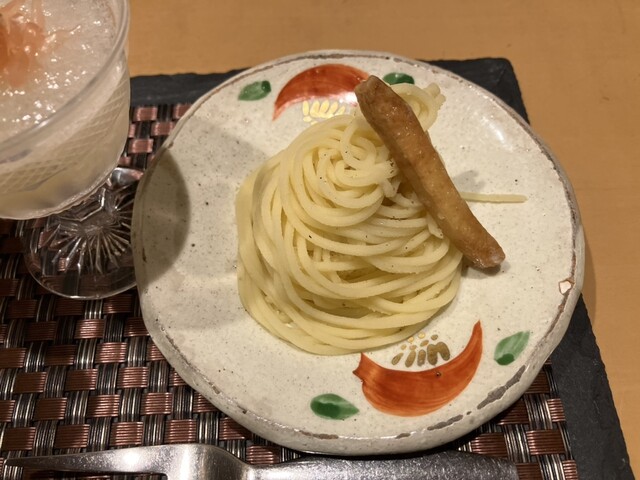 ◆「秋香る」は、旬の向付けの部、焼き霜造りの鰆と平目の向付けと甚五右ヱ門芋の炊き合わせで構成されている。向付けには鰆と平目、上にえんがわと黄菊と紫菊で当地の名産もってのほかがトッピングされ、茹で菊とすだちが添えられている。平目はとても柔らかく新鮮、菊も癖もなく美味しい、鰆はすだちを絞って頂く。キレが良い喉越し、繊細淡麗な錦爛秋あがりととてもよく合う。炊き合わせは、室町時代から伝わる一子相伝の特別な里芋を鰹出汁で煮込み油で軽く揚げ、滑子餡を掛け、おろしと岩海苔を添えた逸品。里芋は柔らかく蕩けるよう、それでいて粘り気もあり食べ応えがある、滑子とおろしと一緒に美味しく頂き、秋の名残りを惜しむ。