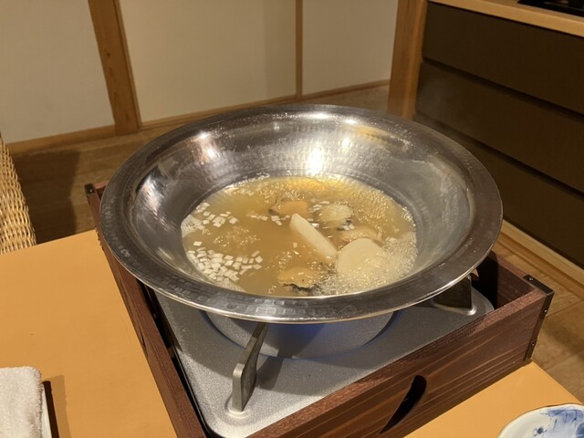 ◆「温もり」は、お椀の部、椀の物を中心に和え物と凌ぎで構成されている。漆器ではなく花柄の素敵な磁器に貝真薯(蛤、蜆、帆立、浅利のすりおろし)の湯葉巻きが配され、その上から貝出汁と鮑と蕪が注がれた椀の物、そしてその横に赤根ほうれん草とふかひれに胡麻掛けした和え物、その上に凌ぎとして名物山形牛の混ぜご飯。眼前で温めて注いで頂いた貝出汁が本当に滋味深く五臓六腑に沁みわたる最高傑作、真薯も変わっていて、鮑も蕪も柔らかく出汁とよく馴染みとても美味しい。赤根ほうれん草は爽やかな甘さが感じられ、胡麻ドレッシングであっさりと頂く。混ぜご飯は、味わいが複雑で癖になる味、脂まで美味しく、山椒が効いてとてもいい。