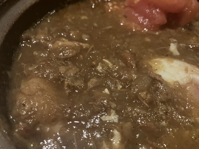 ほどなくして運ばれて来たのは、琥珀色に輝くスパイスライスと、重厚な土鍋。蓋を開けると、一面挽き立てのスパイスの香りが立ち込める。トッピングに皮を剥いたトマト、具材はホロホロの鶏肉、挽き肉、野菜や玉葱がとけ込んだ濃厚なルー、そして半熟玉子が入っている。まずスープを一口頂く、初めに玉葱や野菜の甘み、昆布や鶏ガラの奥行きのある出汁の味わいが感じられ、その後に爽やかな苦みや鋭い辛みなどスパイスの複雑な味覚の層が幾重にも重なっていく。