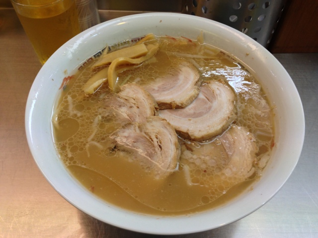 ラーメンは、がっつり系で、スープもコテコテな感じです。麺は、太いストレート麺で、スープとともに、ノドにするするっと入っていく感じ。カウンターの上に、ネギが置いてあるので、お好みでネギを入れることができます。