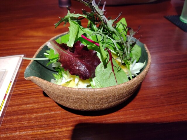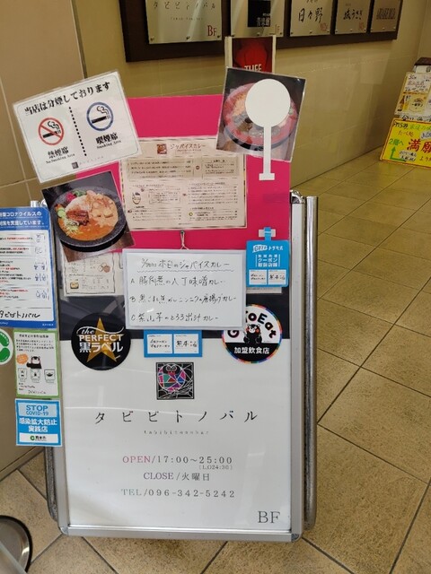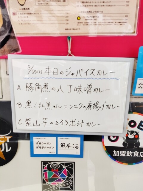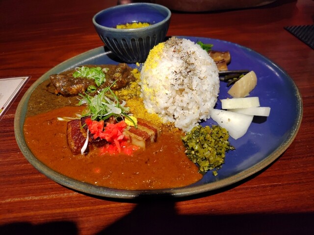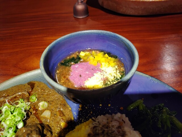 ジャパイスカレー 熊本市役所の裏にある タビビトノバル さん ビルの地下 豚角煮の八丁味噌カレー 黒ごまと焦がしニンニクの唐揚げカレー 紫山芋のとろろ出汁カレー 1500円 ランチセット 350円 サラダ、黒糖ラッシー 付 12:00頃来たらすんなり入れた。 バーカウンター に案内。なかなかお洒落な内観。GODIVAのリキュールが置いてあって飲んでみたかったけど昼だからやめといた。サラダも カレーも めちゃ旨かったけど、驚いたのが蕪やわらびの漬物や副菜がお出しが効いていて塩気が少ないお上品な味でとても美味しく、まるで京都に来たよう。聞いてみたら自家製のお漬け物で、こちらのシェフは以前京都の有名ホテルにいらっしゃったそう。豚の 角煮 や唐揚げ も味がしっかりしていて超美味。そしてスプーンですくうと糸を引く粘りのある紫山芋のカレー。初体験な味だったけどとても美味しかったです。ホールスパイス も結構いっぱい入っていて、クミンシードはよく効いていた。優しい出汁と刺激的なスパイスが合わさった細部まで丁寧に作られたプレートでウーンとうなるほどの 絶品 でした。ご馳走様でした。