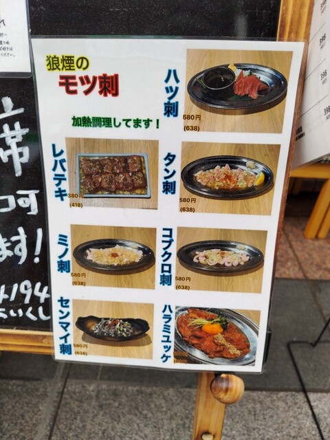 もつ焼き狼煙 さんで ちょい呑み ハラミユッケ もつ煮込み お通し れば ×2 あぶら はつ ちれ (脾臓) ×2 つくね この日は日曜日だったので狼煙さんは12時オープン。空いている昼間にちょい呑みしてきた。狼煙さんの新鮮なホルモンはどれも最高に旨かったです。特に角が立った新鮮なレバーはとろけるような旨さでした。ご馳走様でした。また伺います。