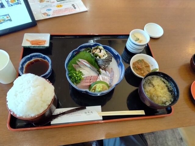 関あじ関さば館 さんで夕方17:00前にだいぶ遅く ランチ 関あじ関さば関ぶり食べ比べ御膳 2420円 ご飯大盛220円 クロメ汁 220円 計2860円 この日は朝10:30に松山市を出発して三崎港に14:00頃到着したけど、3連休中日だったせいかフェリーに乗る車が多過ぎて14:30のフェリーには乗れず15:30のフェリーで三崎港を出て佐賀関港 に着いたのが 16:40 この日は朝食だけしか食べてなかったので港近くのこちらでちょっと休憩&ランチ。過去にも湯布院や別府や大分市内で関さば関あじは食べたことはあったが、ここのはそれらと比較しても鮮度や身の締まりが全然違う。はっきり言って今まで食べたやつは関さば関あじをあまり名乗って欲しくない。ここの関さば関あじはさっきまで生け簀で生きてたやつを活き造りしているのだそう。噛んだときの感触と脂の出る感じが最高でめっちゃ美味しかったです。とにかく身がプリプリで張りがありました。クロメ汁はモロヘイヤみたいなネバネバ系のお吸い物。佐賀関港は東九州道の津久見ICから車で約1時間、大分市街地からも約1時間かかる場所だけど、本物の 関あじ 関さば を食べたかったらここまで行く価値はあると思う。ここは本当に行って良かったと思った。とても美味しかったです。ご馳走様でした。