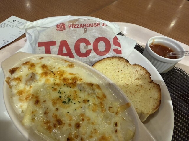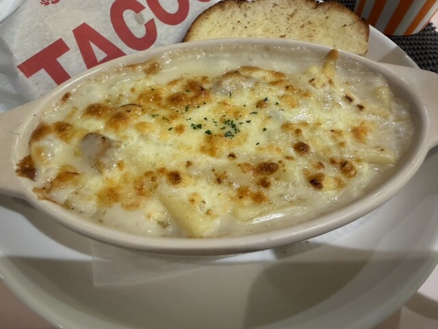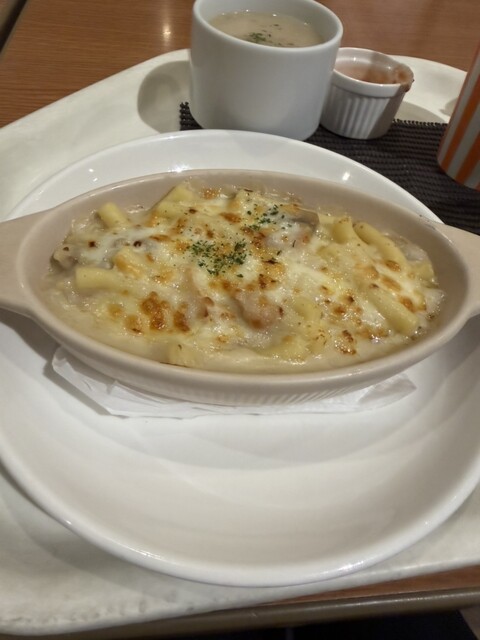 ミニタコスと鶏グラタンセット、日替わりスープ付き