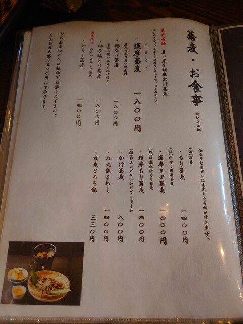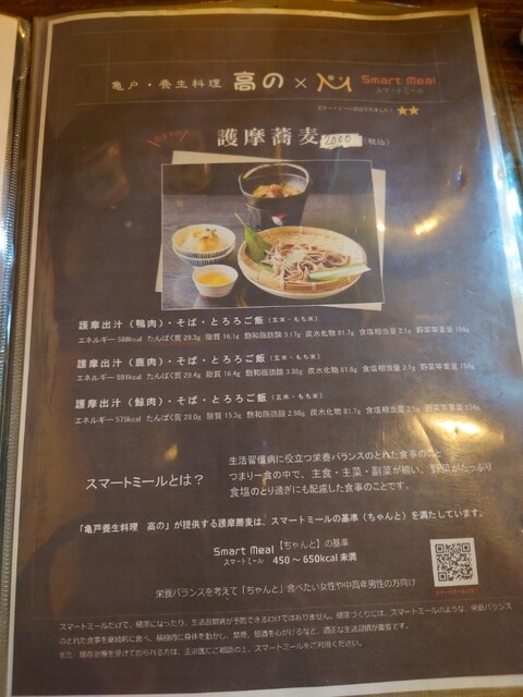 大海老天ざる蕎麦3,200円という別メニューにビビりながらメインメニューの筆頭である護摩蕎麦を注文、お肉が鴨、鹿、鯨、から選択可能とのことで無難な鴨をオーダー