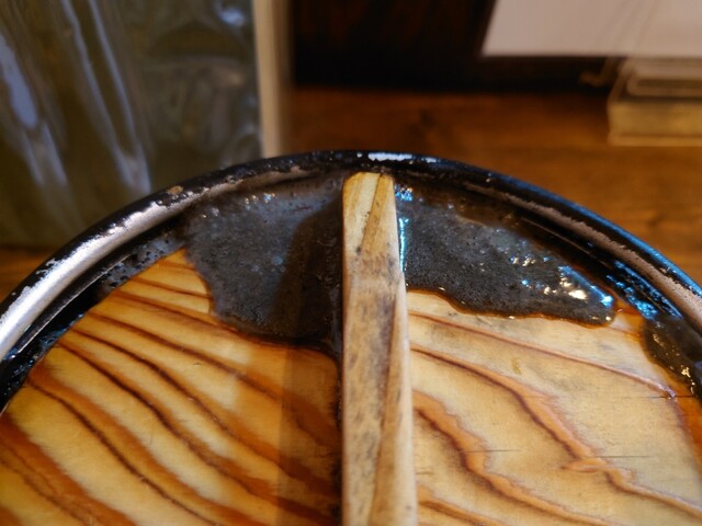 3〜4分ほどで湯気が、すると鍋のフタのスキマから真っ黒なドロドロの液体が溢れてくる、なんじゃこりゃあ(@松田優作)、慌ててメニューを見返すと真っ黒な胡麻出汁蕎麦との但し書きが、なるほど黒胡麻なのかと一安心しているとお蕎麦到着、平打ちの太っいヤツ、なんじゃこりゃあと叫ぶ迄には至らずともインパクト十分、これを鍋に入れて食べる訳ね