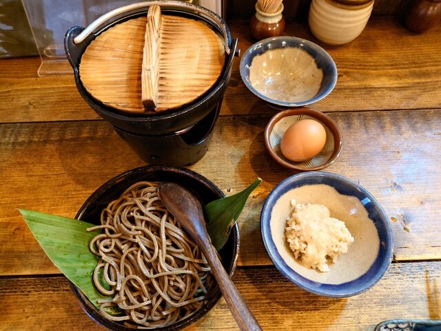 10分弱で小鍋が運ばれてきて固形燃料に火がつけられる、〆の雑炊用のご飯と玉子も一緒に、雑炊にするのにとろろがかけられているんだ、うーん養生っぽい