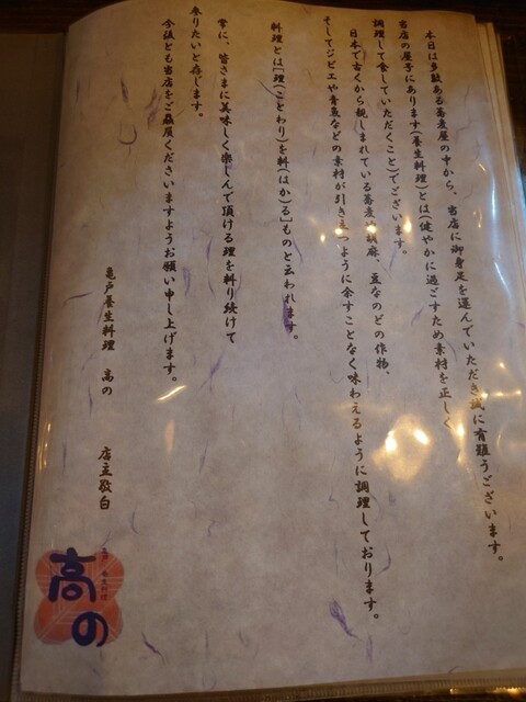 そういや看板は “蕎麦” ではなく “養生料理” って付いてるのね、メニューを見るとジビエの文字が、おそば屋さんというよりはお酒がメインなのか、お茶と一緒にお漬け物が出てくる、美味しい