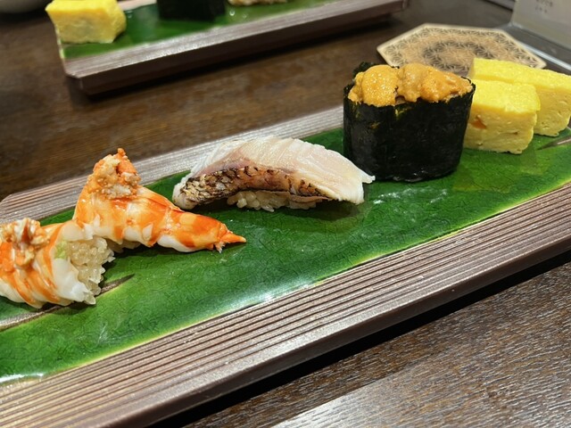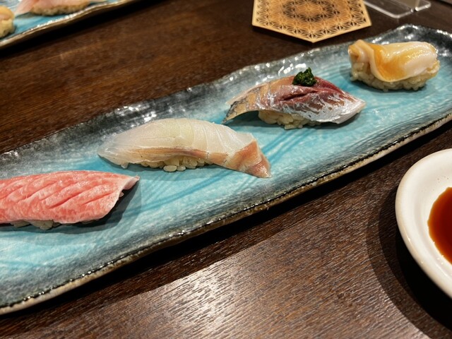 握り(大トロ、スズキ、アジ、石垣貝、大トロあぶり、シロイカ、イワシ、ボタンエビ、ノドグロ、バフンウニ)