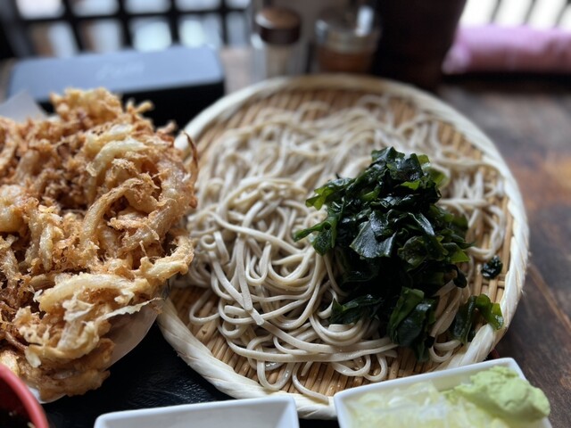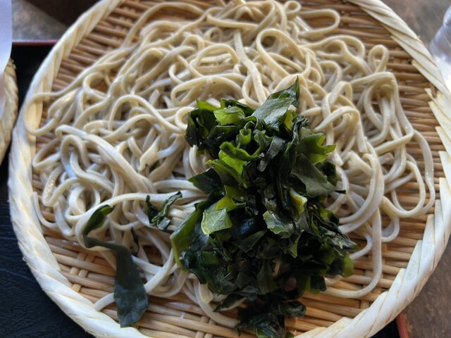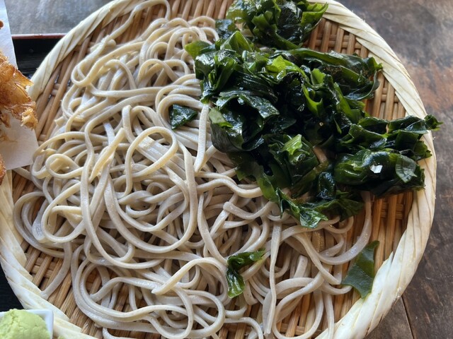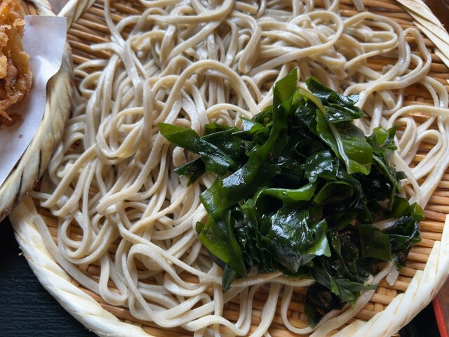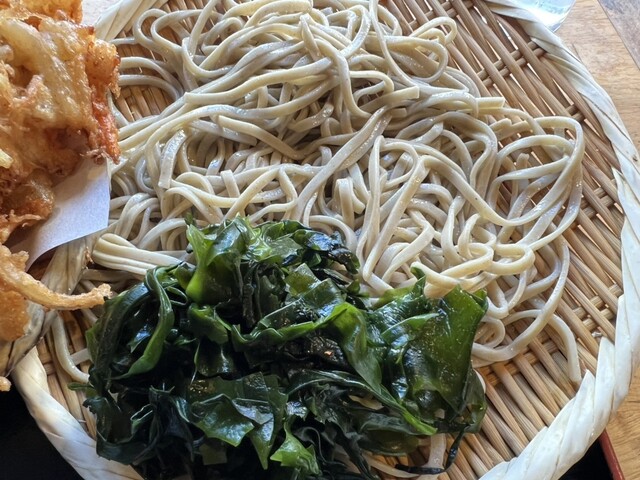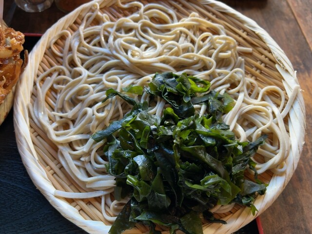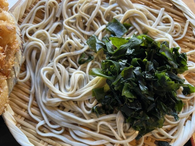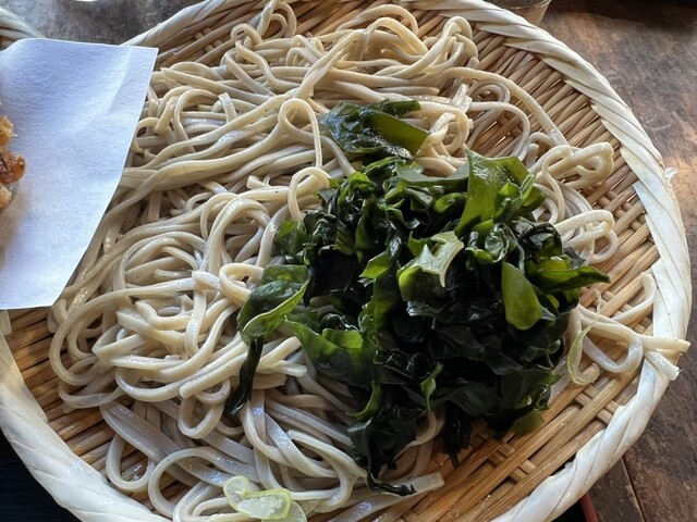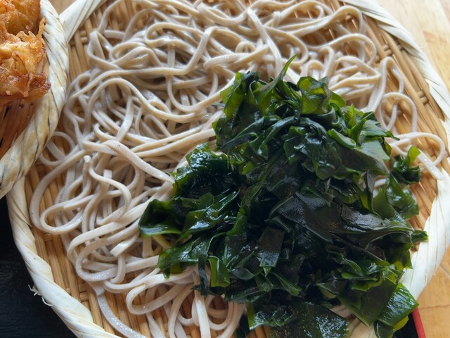 天ざる蕎麦の蕎麦と無料トッピングのワカメ