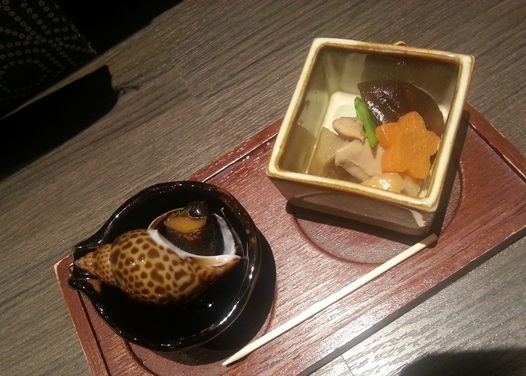 お通しは、つぶ貝と、鶏肉&お野菜の煮しめ