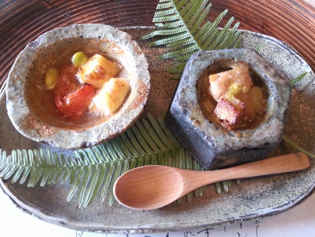 中皿 豚とアスパラガスのポテトソースと、湯葉と枝豆、トマトの石焼