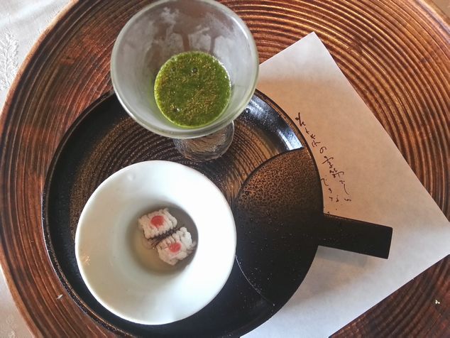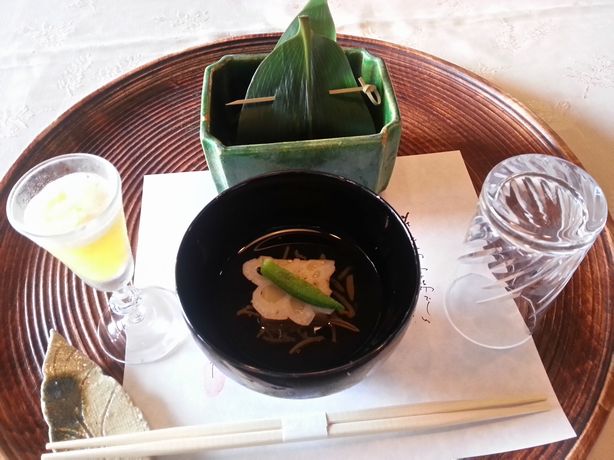 先付 焼茄子豆腐・ミニオクラ・新蓮根のスライス・じゅんさいの美味出汁と、穴子の黒米寿司(笹の葉に包まれています)