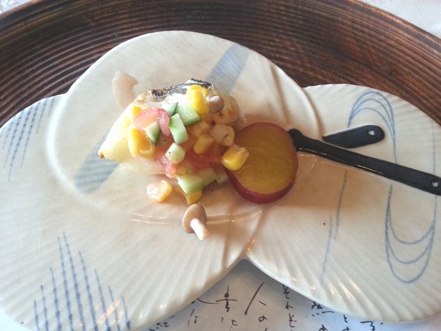 前菜 もろこし冷スープ・素麺瓜と椎茸、湯葉蒟蒻白和え・芋茎胡麻ソース・無花果のカナッペ・穴子二見焼・烏賊松風・夏鴨ロース煮、つぶマスタード添え