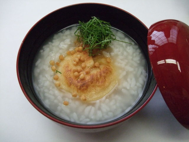 お餅入りのおかゆで、大葉と紀州産の梅に昆布出汁がとてもマッチしていて
