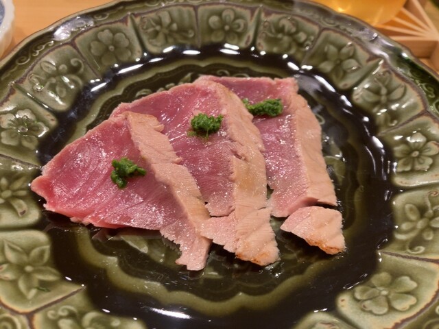 鯵、摘み、マグロを追加して店主オススメの都城柳田酒造の焼酎をたらふく飲んで22000円。