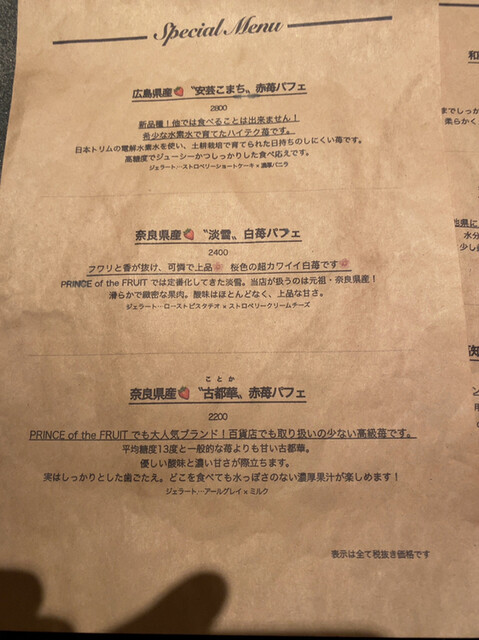 いちごの色々な種類のパフェがあり、この日は、広島県産の安芸こまち
