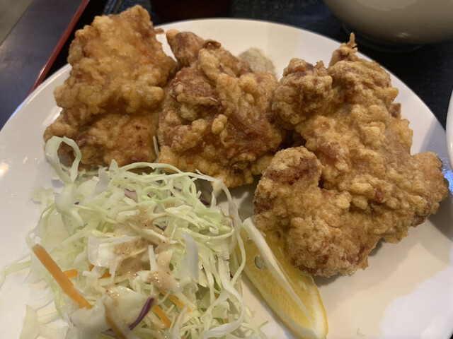 昼のメニューが夜もプラス100円で食べれて、激安セットの唐揚とチャーハンを注文。