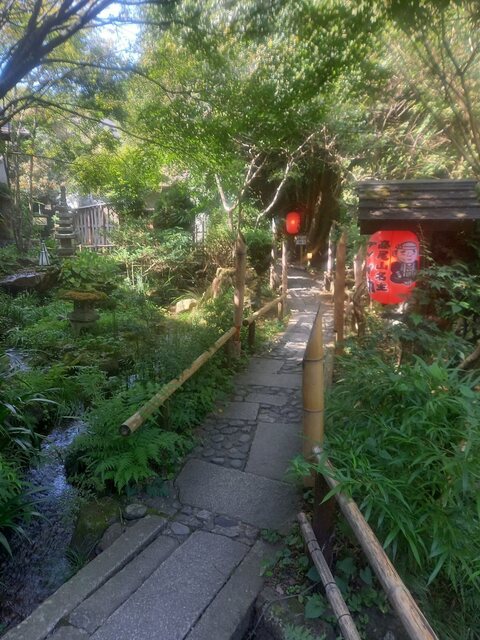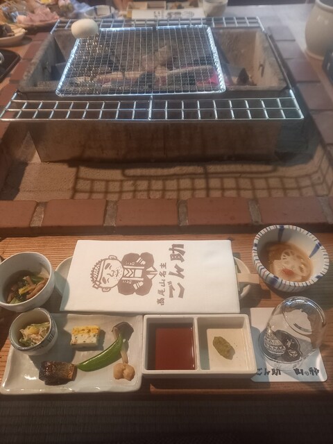 前から気になっていた高尾山にある炉端焼きの店『ごん助』へ初訪問。高尾山口駅に着いた後、事前に予約をしていた店の送迎バスに乗り山の中の道を走って約10分後、店に到着。駅から店まで少し距離があるので少人数でも送迎バスが利用できるのは有難いと思った。バスから降りて古民家風の建物の店に入り受付でメニューを選択。いくつかあるコースの中から肉や魚など色々な種類が食べられるおはやしコースにした。その後、店の地図を渡され受付のある建物を出ると目の前には広大な庭とたくさんの鯉やアヒルまでいる大きな池があり、地図を見ながら庭を歩いて離れ個室の建物へ移動。なんでも6000坪の広大な敷地の中に24棟の離れ個室があるとの事。個室に入るとすぐに料理とドリンクが運ばれてきた。早速テーブルにある囲炉裏でアワビやのどぐろなど高級食材を焼いて食べた。炉端焼きの店には何度も行った事があるけど自分で焼くのは初めて。この店にはジビエの単品メニューもあり、ダチョウ刺しと鹿ロース串を追加で注文した。ダチョウ刺は初めて食べたけど、馬刺しに似た味で鹿ロース串は肉厚でビーフジャーキーに似た味で絶品だった。食事の最後にデザートが運ばれてきて、高尾山口駅まで1時間に2本ぐらい送迎バスが出ているらしく何時がよいか聞かれ帰りも駅まで送迎バスで送ってもらった。サービスも良く雰囲気も抜群の店で絶品の炉端焼きを堪能して非日常的な気分を味わう事ができた。また行きたい。