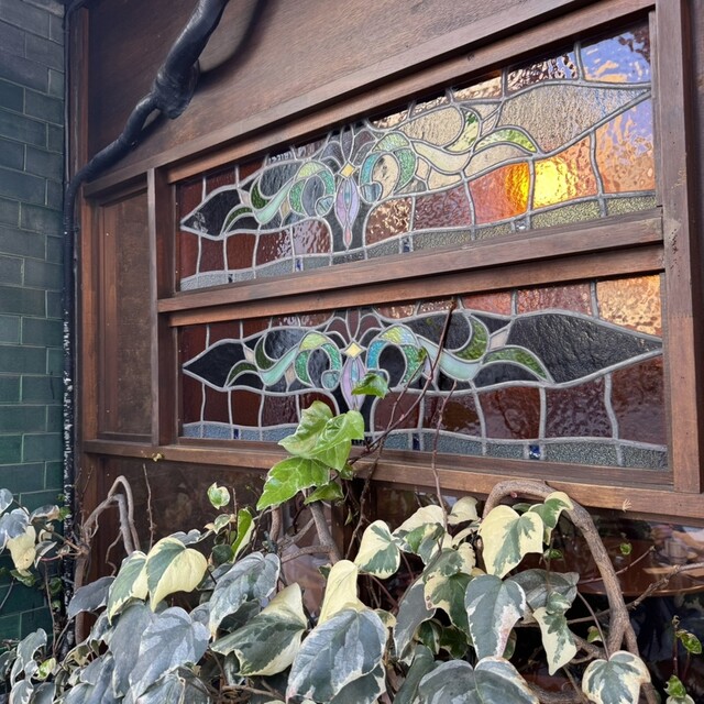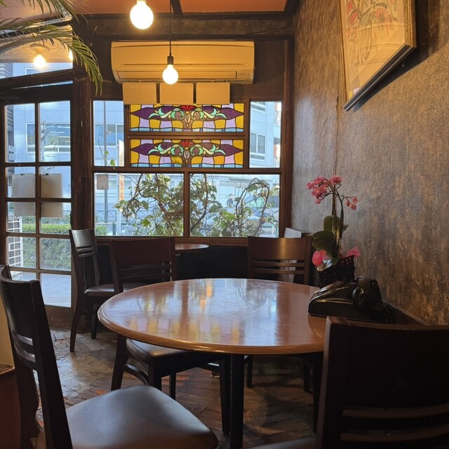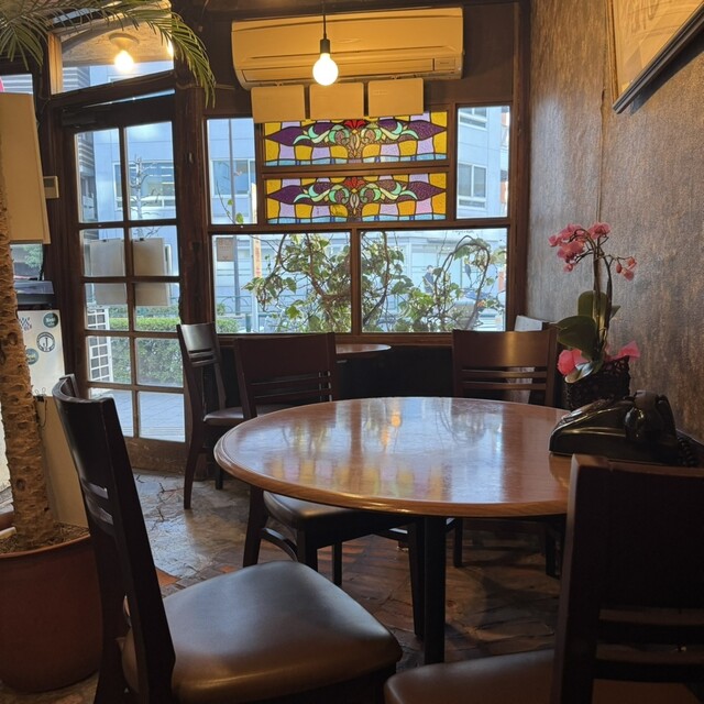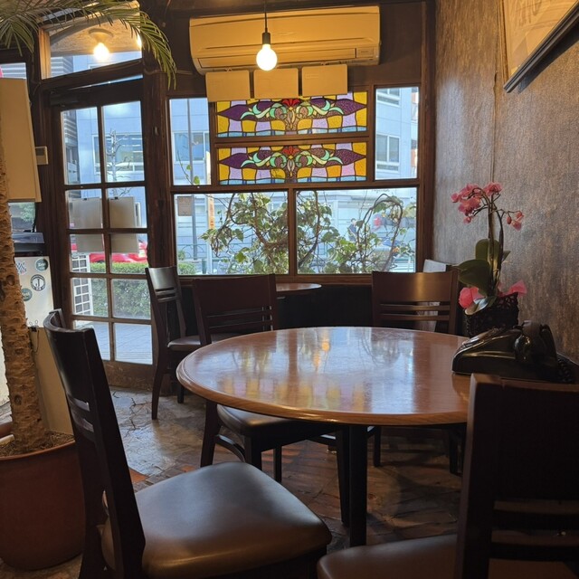 昔ながらの喫茶店らしい内装で窓のステンドグラスが素敵すぎます