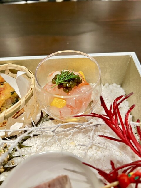 ・グラスに、人参のババロア、甘エビマリネ、キャビアが乗ってます