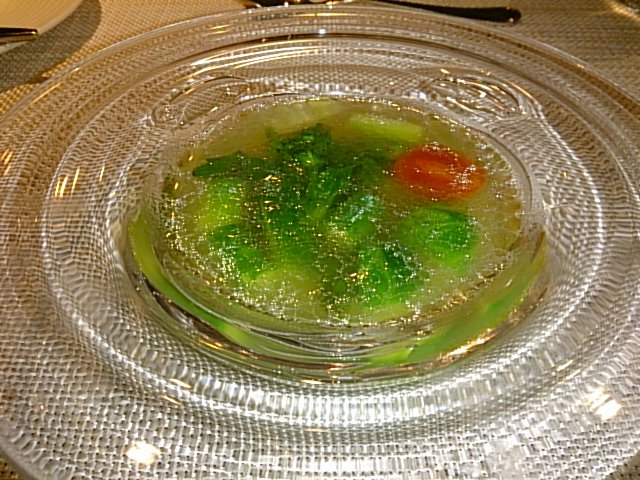 うさぎからとったダシと、アスパラ、菜の花、トマトのスープ。