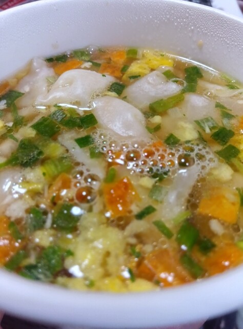 持参したマルちゃんのワンタンを汁物として食べれば