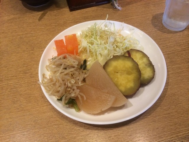野菜ビュッフェはキャベツの千切り、大根煮、サツマイモ、もやしのおひたし、果物のゼリー寄せ。