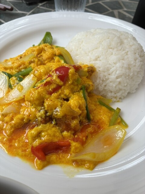 入口には可愛らしいタイの民族人形が勢ぞろい。天気もまずまずだし、テラスでランチもいいねえなんて話が合って即決。メニューを見てせっかくなのでいちばん美味しそうなものをエイやッと選択。蟹のカレー炒めセット、プーパッポンカリーですね!