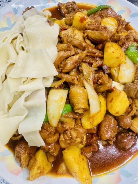 大盤鶏の拌麺:初めて大盤鶏を食べた時の感動が蘇る、後を引く味わい。柔らかい骨付き鶏肉、ほくほくのじゃがいも、シャキシャキのピーマンとパプリカ、スープをたっぷり絡めた手打ち麺。大新疆ならではのエキゾチックな風味。