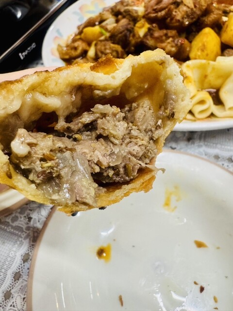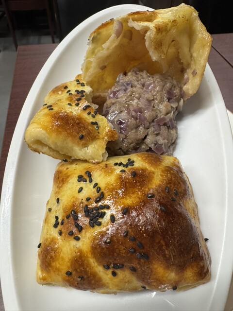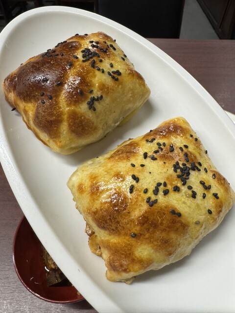 焼き包子:必食の逸品、外はサクサク中はしっとり、ピヤジ風羊肉餡はジューシーで香りが広がる。